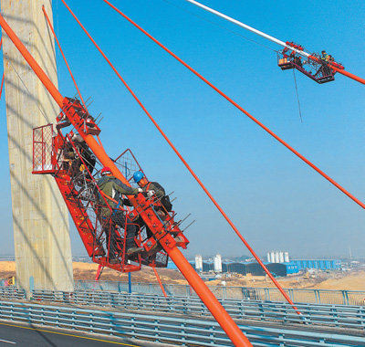 工人在位于安徽省合肥市廬江縣的引江濟淮文昌西路大橋上安裝斜拉索防護帶。